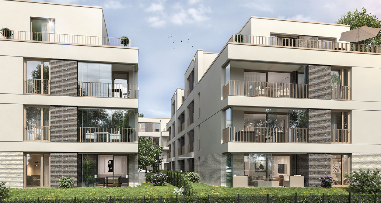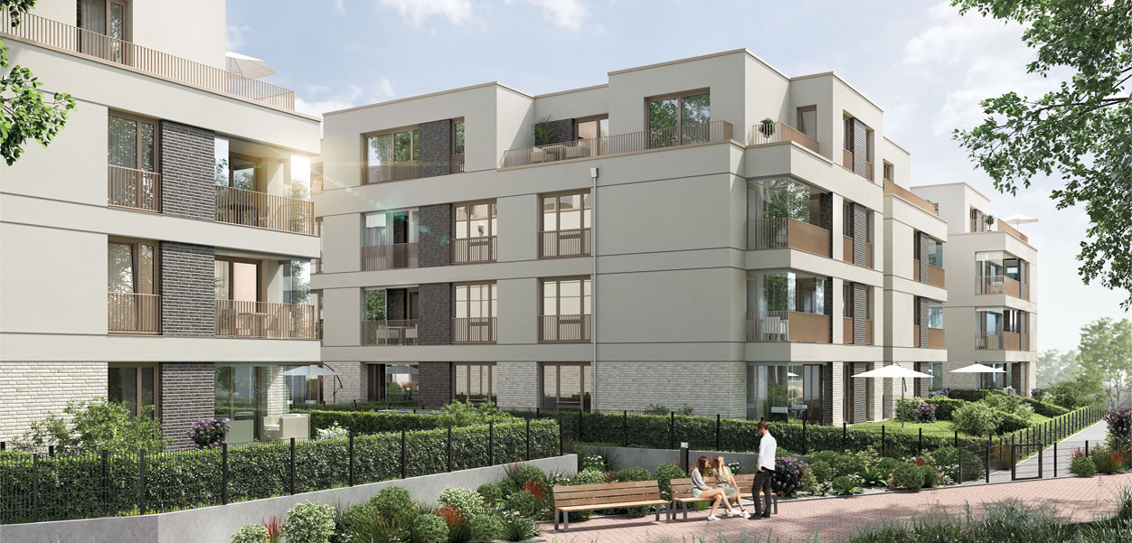 Es entstanden 66 attraktive, hochwertige Wohnungen und eine Tiefgarage. Das Quartier „Wohnen am Obstmarkt“ liegt zentral und doch im Grünen.